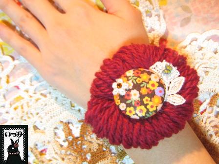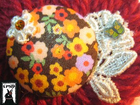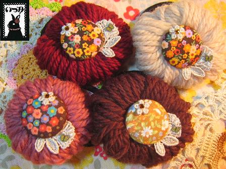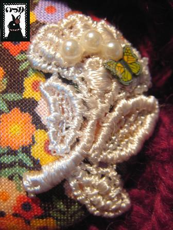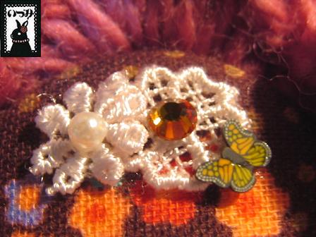 以前よりくるみぼたんのサイズを大きくして、紅茶染めしたレースフラワーや蝶々の飾り、スワロフスキーストーンをあしらいました。