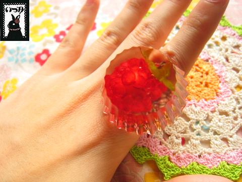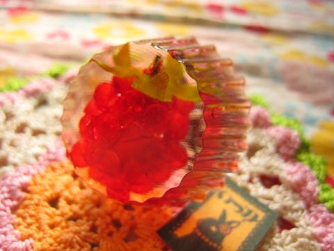 ↓↓↓モチーフがかなり大きめでインパクト大!な、『木苺ゼリーの指輪』は、透明樹脂の中にフェイクラズベリーを閉じ込めました。